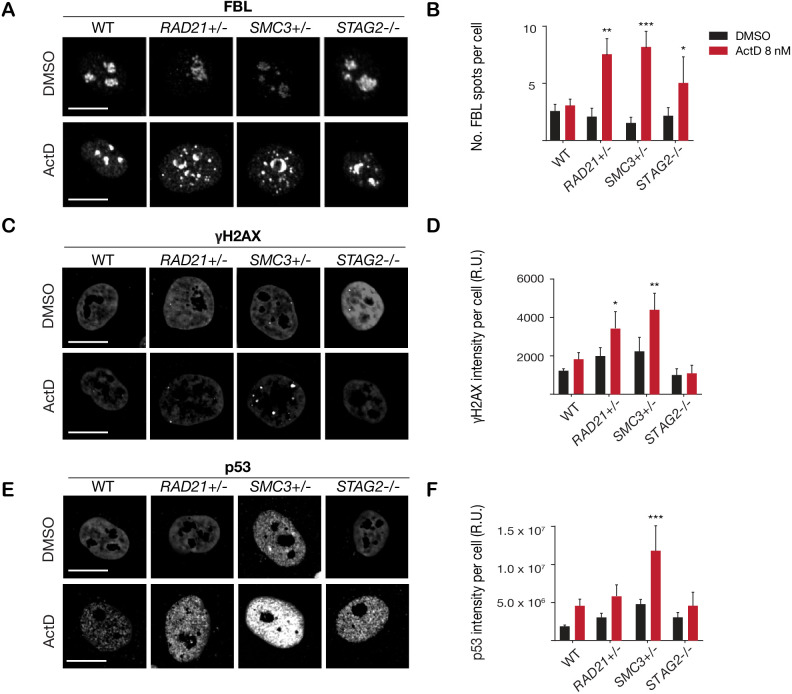 (A) Representative image and (B) quantification of nucleolar dispersal observed in parental (WT) MCF10A cells and cohesin-deficient clones after exposure to a DNA damaging agent, Actinomycin D (ActD) 8 nM. Fibrillarin (FBL) staining was used as a marker for nucleoli. (C) Representative image and (D) quantification of DNA damage foci observed in parental (WT) MCF10A cells and cohesin-deficient clones after exposure to ActD. An antibody detecting γH2AX was used to visualize foci of DNA double-strand breaks. (E) Representative image and (F) quantification of nuclear p53 in parental (WT) MCF10A cells and cohesin-deficient clones after exposure to ActD. A minimum of 500 cells was examined per individual experiment. n = 3 independent experiments, mean ± s.d., one-way ANOVA: *p≤0.05; **p≤0.01; ***p≤0.0005. Scale bar, 15 μM. Source data is available for Figure 2B,D,FFigure 3—source data 1.