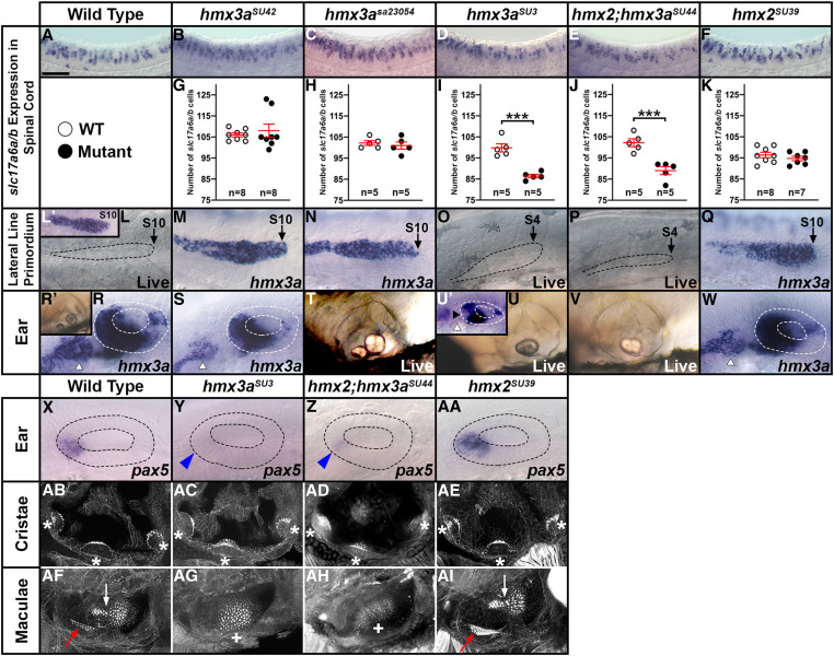 Only some hmx2/3a alleles have mutant phenotypes. (A–F, L–AI, L’, R’ U’) Lateral views. Rostral, left; Dorsal, up. (A–F) Expression of slc17a6a/b in spinal cord at 27 hpf. (G–K) Number of cells expressing slc17a6a/b in a precisely defined spinal cord region adjacent to somites 6–10 at 27 hpf. Data are depicted as individual value plots and the n-values for each genotype are also shown. For each plot, the wider red horizontal bar depicts the mean number of cells and the red vertical bar depicts the SEM (SEM values are listed in Table 2). All counts are an average of at least five embryos. Statistically significant (P < 0.001) comparisons are indicated with brackets and three asterisks. White circles indicate WT data and black circles the appropriate mutant data as indicated in key under panel A. All data were first analyzed for normality using the Shapiro–Wilk test. Data in G is not normally distributed and so a Wilcoxon–Mann–Whitney test was performed. Data sets in H–K are normally distributed and so the F-test for equal variances was performed, followed by a type 2 Student’s t-test (for equal variances). P-values are provided in Table 2. (L–Q, L’) Lateral line primordium phenotypes examined either by hmx3a expression (L’, M, N, Q) or live (L, O, P) at 27 hpf. (R–AI, R’, U’) Ear phenotypes examined either by hmx3a expression at 27 hpf (R, S, U’, W), live at 4 d (R’, T–V), pax5 expression at 24 hpf (X–AA) or phalloidin staining at 4 d (AB–AI). (A–K). There is no change in the number of spinal excitatory neurons in hmx3aSU42 (B and G) and hmx3asa23054 (C and H) and hmx2SU39 (F and K) mutant embryos compared to WT (A). In contrast, there is a statistically significant reduction in hmx3aSU3 (D and I) and hmx2;hmx3aSU44 (E and J) mutant embryos. (L–Q, L’). At 27 hpf, the tip of the lateral line primordium (black dotted line, L) has reached somite 10 (S10) in WT embryos (L and L’). This rate of migration is unchanged in hmx3aSU42, hmx3asa23054, and hmx2SU39 mutant embryos (M, N, Q). (O and P) In contrast, the lateral line primordium fails to migrate in hmx3aSU3 (O) and hmx2;hmx3aSU44 (P) mutant embryos. Instead, it is stalled adjacent to somites one to four (S4, somite 4). (R, S, U’, W) hmx3a expression in the ear (inside white dotted lines) and in presumptive neuroblasts anterior to the ear (white arrowheads) is unchanged in hmx3aSU42 (S) and hmx2SU39 (W) mutants, compared to WT embryos (R), but is severely reduced in both the presumptive neuroblasts anterior to the ear and the anterior ear (black arrowhead) in hmx3aSU3 mutants (U’). (T) hmx3asa23054 mutants show incompletely penetrant, variable otolith fusion phenotypes, ranging from no fusion (like WT ear in R’), through incomplete fusion (T), to complete fusion, like that observed at full penetrance in hmx3aSU3 (U) and hmx2;hmx3aSU44 (V) mutant embryos. (X–AA) The expression of pax5 in the anterior ear (inside black dotted lines) is unchanged in hmx2SU39 (AA) mutants, compared to WT embryos (X), but is severely reduced (blue arrowhead) in both hmx3aSU3 (Y) and hmx2;hmx3aSU44 (Z) mutants. (AB–AI) The three cristae of the ear (white asterisks) form normally in WT (AB), hmx3aSU3 (AC), hmx2;hmx3aSU44 (AD), and hmx2SU39 (AE) mutants. In contrast, the spatially distinct anterior (utricular, red arrow) and posterior (saccular, white arrow) maculae are unchanged in hmx2SU39 (AI) mutants, compared to WT embryos (AF), but are fused and are located in a more medio-ventral position (white cross) in hmx3aSU3 (AG) and hmx2;hmx3aSU44 (AH) mutants. However, there are no obvious differences between hmx3aSU3 and hmx2;hmx3aSU44 mutants. Bar, 50 µm (A–F), 30 µm (L–W), 20 µm (X–AA), 60 µm (L’, R’, U’, AB–AI). Panels X, Y, AB, AC, AF, and AG are reproduced from Hartwell et al. (2019) as per the Creative Commons Attribution (CC BY) license at PLoS Genetics.