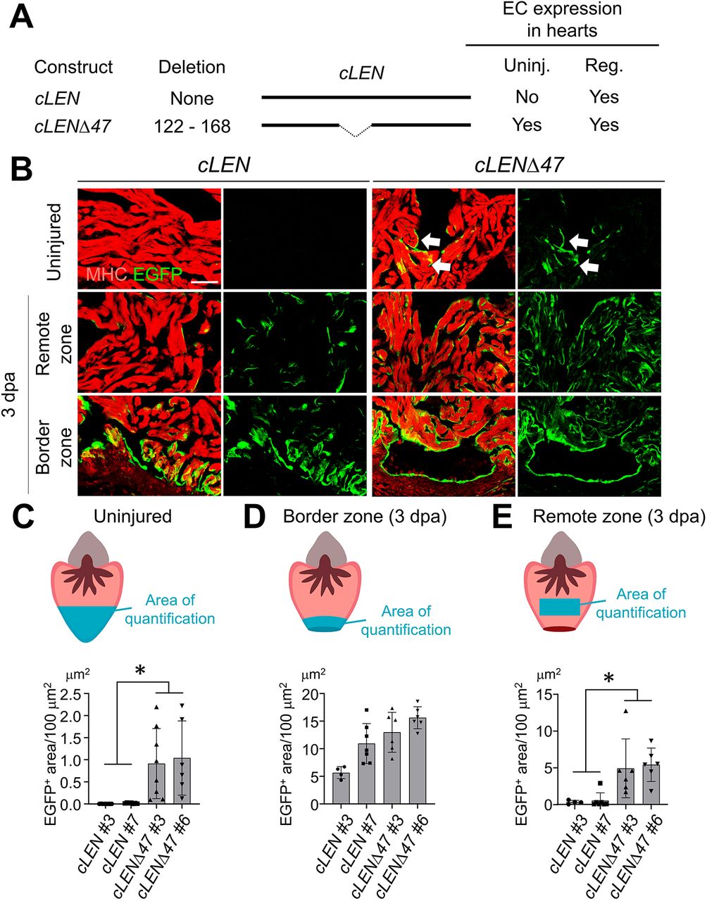 Fig. 3 Active repression of cLEN establishes spatiotemporal gene expression in uninjured and regenerating hearts. (A) Transgene constructs examined for reporter gene expression. Endocardial expression results are summarized on the right. EC, endocardial cell. Uninj. and Reg. correspond to uninjured and 3 dpa regenerating hearts, respectively. (B) Images of sections of transgenic fish carrying cLEN and cLENΔ47. Top, uninjured hearts. Middle, remote zone of 3 dpa hearts. Bottom, border zone of 3 dpa hearts. The arrows indicate endocardial EGFP expression. (C-E) Top, schematic of uninjured and 3 dpa hearts. Area of quantification is marked in blue. Bottom, quantification of EGFP+ area per 100 µm2 cardiac tissue in uninjured hearts (C), border zone (D) and remote zone (E) of 3 dpa hearts. Data are presented as the mean±s.d. Numbers of animals are shown in Table S3. *P<0.05, one-way ANOVA with Tukey's post-hoc test. Scale bar: 100 µm in B.