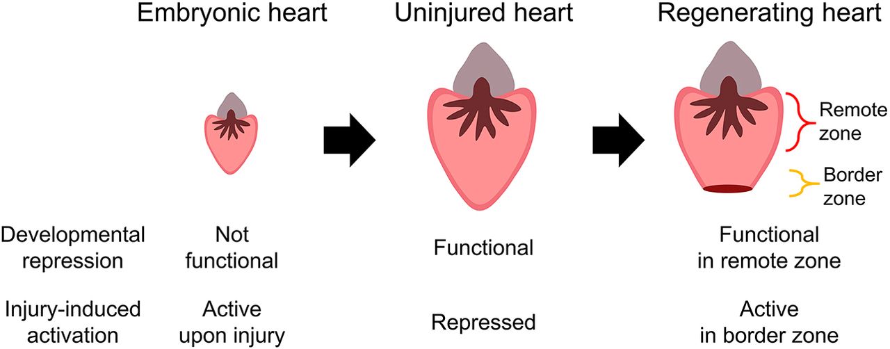 Fig. 7 Proposed model of regulation of the activity of cardiac TREEs in uninjured and regenerating hearts. In uninjured embryonic hearts, cardiac TREEs are inactive; they are activated upon injury. Repression of cardiac TREEs is not functional in the heart in early development. During maturation, cardiac TREEs are actively repressed to prevent aberrant activation in uninjured tissues. Upon injury, the dual function of distinct cis-regulatory elements restricts cardiac TREE activation to the wounded area.
