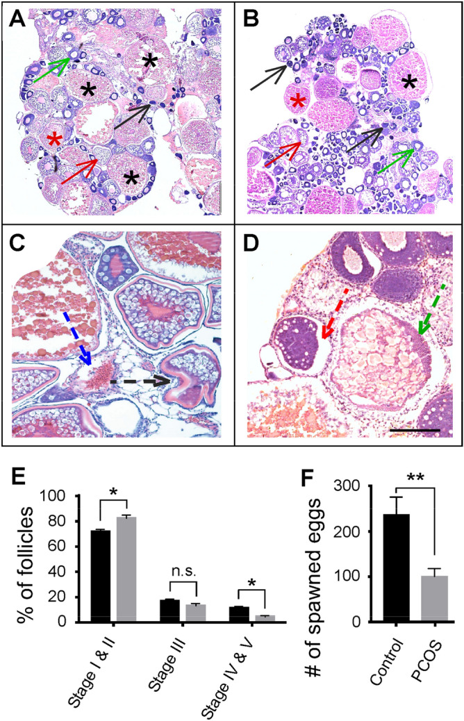 Figure 2 Follicle development and ovulation in control and PCOS zebrafish. (A,B) Histological sections of the ovary. In control fish (A), follicles at different stages could be identified. These include developing follicles (Stages I and II, black and green arrows), transitioning follicles (Stage III, red arrows), and mature follicles (Stages IV and V, red and black asterisks). In PCOS fish (B), more developing follicles but less mature follicles were observed. (C,D) Histological sections that show abnormal follicles in PCOS fish. These include zona pellucida invagination (black arrow), theca hypertrophy/granulosa cell invagination (blue arrow), basal membrane disintegration (red arrow), and basophilic granular accumulation (green arrow). Scale bar: 100 µm in panels (A) and (B), and 50 µm in panels (C) and (D). (E) Percentage of developing, transitioning, and mature follicles in control (black bars) and PCOS fish (grey bars). Note the increase of developing follicles and the decrease of mature follicles in PCOS animals. (F) Ovulation in control (black bar) and PCOS (grey bar) zebrafish. Note the decrease of ovulation in PCOS fish. Data represents the means ± SE (n = 8 in each group). *p < 0.05; **p < 0.01; ns not significant.