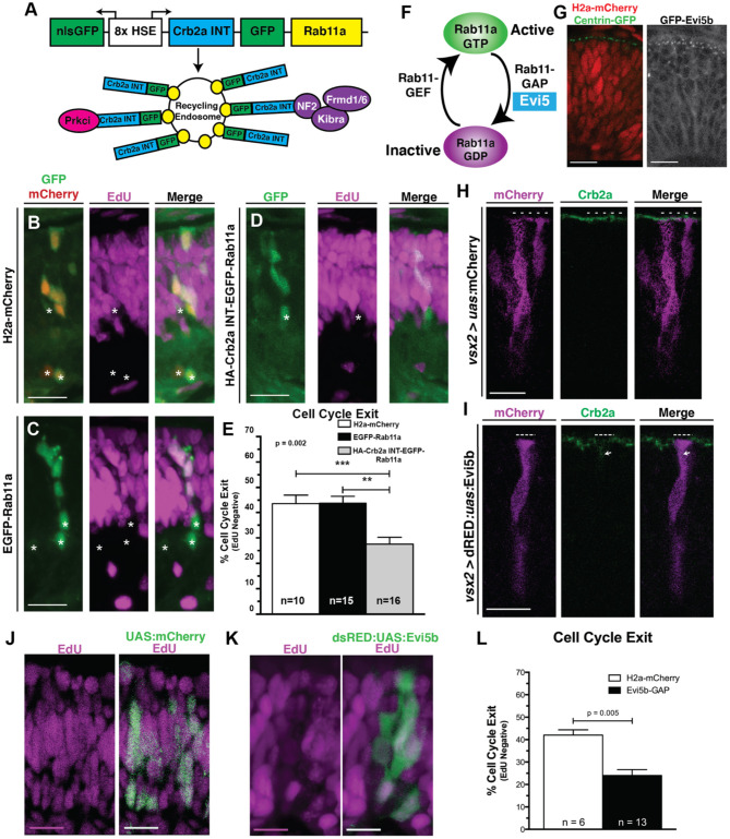 Crb2aINT localized to Rab11a recycling endosomes and inhibition of recycling endosome activity promote RPC proliferation. (A) Schematic of the heat-shock inducible transgene to localize the Crb2aINT to EGFP-Rab11a positive recycling endosomes. (B–D) Images assessing cell cycle exit (EdU negative) within clones of (B) Control (nlsGFP; H2a-mCherry). (C) EGFP-Rab11a overexpression (nlsGFP; EGFP-Rab11a) or (D) Crb2aINT localized to Rab11a-positive recycling endosomes (nlsGFP; Crb2aINT-GFP-Rab11a). Transgene expression is induced through heat-shock at 24 hpf, with EdU pulse from 36 to 48 hpf. (E) Quantification of average cell cycle exit across clones. Graph represents mean percentages of cell cycle exit across clones with error bars indicating SEM. Listed n-values represent number of quantified embryos within each genotype. Statistics are the result of a One-way ANOVA (p = 0.002) followed by a Tukey's multiple comparisons test. ***p < 0.001; **p < 0.01. (F) Schematic of the molecular switching of Rab11a from the GTP-bound active form to the GDP-bound inactive form. Hydrolysis of Rab11a-GTP to Rab11a-GDP is mediated by the Rab11a-GAP, Evi5. (G) Comparisons of centrosome localization (Centrin-GFP; left) to transgenic expression of a GFP-tagged Evi5b (right) in 28 hpf RPCs. Both transgenes localize in apical puncta, suggesting conserved localization of Evi5b to peri-centrosome regions within the developing zebrafish retina. (H,I) Representative (n > 5 embryos/genotype) immunostaining assessing Crb2a localization within 32 hpf RPCs after transgenic expression of either (H) Control (mCherry) or (I) Evi5b transgenes. Dotted lines in (H,I) indicate apical domains of transgenic cells, including regions where Crb2a staining is lost at the apical surface in Evi5b transgenic cells in I. Arrow in I indicates non-apical localization of Crb2a. (J,K) Assessment of cell-cycle exit through incorporation of EdU after a 12-h pulse from 36 to 48 hpf in (J) Control (UAS:mCherry) or (K) Evi5b transgenic clones, with transgene expression driven from by vsx2:Gal4 expression in RPCs. (L) Quantification of average cell-cycle exit (Edu-negative cells; 12 h pulse from 36 to 48 hpf) within transgenic clones of 48 hpf retinas. N's represent number of clones assayed from >4 animals/genotype. Bar graph in (L) represent the means with SEM, with statistics indicating the results of an unpaired Student's t-test. Scale bars represent 25 μm. * in B–D indicates cells counted as having exited the cell cycle (EdU negative).