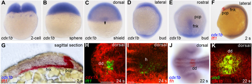 Fig. 1 Fig. 1. cdx1b expression during gastrulation and segmentation stages. RNA in situ hybridization was conducted on embryos from 2-cell (A), sphere (B), shield (C), and bud (D, E) stages using a cdx1b antisense RNA probe. Enriched cdx1b expression in the shield (C, arrow) and forebrain neural keel (E) is shown. Double in situ hybridization was performed on embryos from 2 s (F) stage using cdx1b (blue) and lft1 (red) RNA probes as well as 24 s (H, I) stage using cdx1b (red) and lft1 (green) RNA probes. A sagittal section of stained embryos (G) is shown. Double in situ hybridization was conducted on 22 s embryos with cdx1b (blue) and flh (red) probes (J) or with cdx1b (red) and otx5 (green) RNA probes (K). Scale bar (G) represents 100 μm; scale bar (H, I) represent 40 μm dd, diencephalon; fnk, forebrain neural keel; h, heart; pcp, prechordal plate.