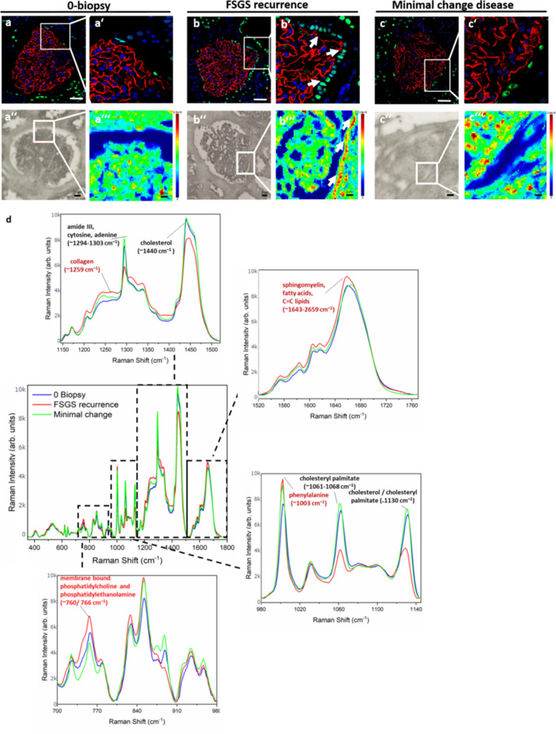 Raman spectroscopy gives a molecular fingerprint of recurrent FSGS on tissue level. (a,b) PAX8 staining (green) and synaptopodin staining (red) of a glomerulus from the kidney biopsy at transplantation (0-biopsy) (a,a′) and at the time of FSGS recurrence (FSGS recurrence) (b,b′) and from a patient with minimal change disease (c,c′) showing increased PAX8 staining in the Bowman’s capsule (arrow head in b′), scale bar = 100 µm. Representative bright field illumination (a″,b″,c″) and heat map of Raman signal intensity (a‴,b‴,c‴) of a glomerulus from the kidney biopsy at transplantation (0-biopsy) (a″,a‴), at the time of FSGS recurrence (FSGS recurrence) (b″,b‴) and of a biopsy with minimal change disease (c″,c‴) showing increased Raman signal at the region of parietal epithelial cell in the Bowman’s capsule (arrow head in b‴). Scale bar = 50 µm. (d) Mean Raman spectra of three glomeruli from the kidney biopsy at transplantation (blue line) and three glomeruli at the time of FSGS recurrence (red line). Assignments of the Raman peaks according to the literature are given.
