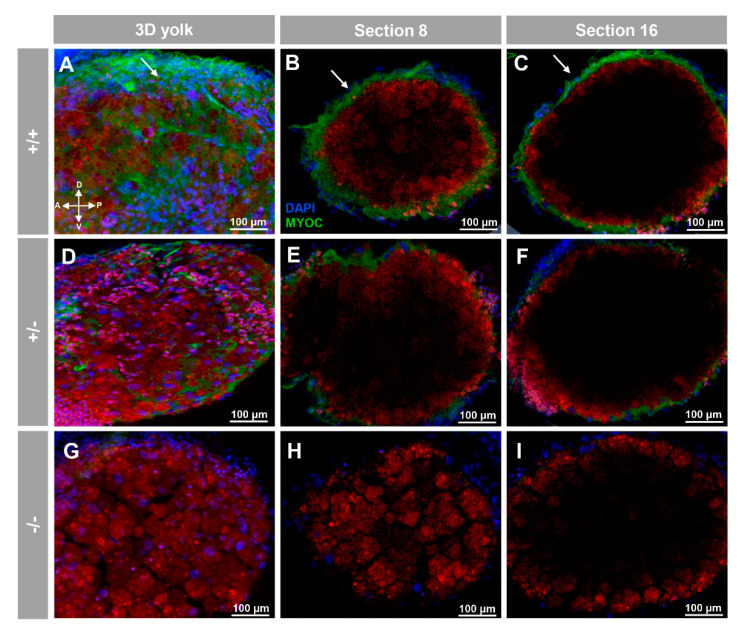 Figure 3 Fluorescent whole-mount immunohistochemical detection of myoc in the yolk of zebrafish larvae (96hpf). Wild-type (A–C), heterozygous (D–F) and homozygous (G–I) myoc mutant embryos were incubated with chicken anti-myocilin (TNT) primary antibody and a Cy2-conjugated goat anti-chicken IgY secondary antibody. Three-dimensional reconstruction from z-stack scanned confocal microscopy images (A,D,G) of the yolk. Sections (92 μm) 8 (B,E,H) and 16 (C,F,I), were selected from z-stack images to show the precise localisation of the green signal on the yolk’s surface (arrows) (A–C). Blue: DAPI nuclear staining. Green: Cy2-conjugated goat anti-chicken IgY secondary antibody. Red: tissue autofluorescence. The cross indicates the position of the embryonic axes (D: dorsal; P: posterior; V: ventral; A: anterior). The images are representative of the result observed in 10 embryos. The negative controls are shown in Figure S3D–F. Two-dimensional confocal image z-stacks are show in Supplementary Video S2.