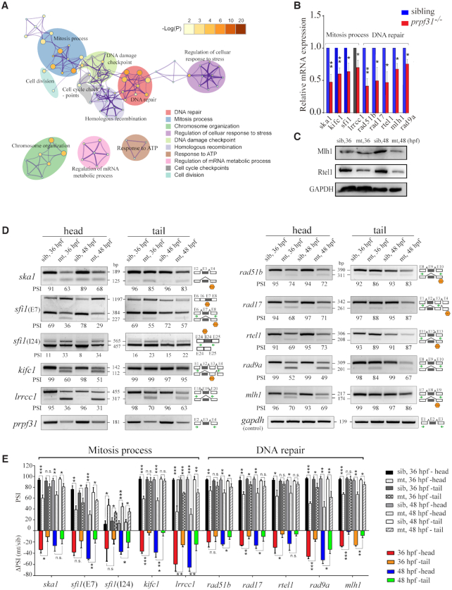 Prpf31 modulates the alternative splicing of a subset of genes involved in DNA repair and spindle assembly. (A) Significantly overrepresented (P < 0.05, enrichment score ≥ 2) DNA repair and mitosis process- associated biological process among upregulated IR and ES DSEs as determined by GO functional enrichment analysis. The top 10 biological process affected by DS events were shown. Node size and color correspond with enrichment score and log(P) value, respectively. (B) The mRNA levels of some genes were significantly down-regulated among DNA repair and mitosis process in RPCs, as detected by RT-PCR. (C) Western blot showed the protein expression of genes with altered splicing efficiency in (B). (D) Increased proportion of transcripts with IR and/or ES among DNA repair and mitosis process in RPCs, as detected by PCR. Sizes (in bp) for major and minor mRNA isoforms (black lines). Head, tail, template cDNA was obtained from the head parts or tail parts of the embryos respectively. PSI values, marked below the DNA band; the black arrows indicate the primers used in this experiment; Hexagon, There was a premature termination codon (PTC) in the corresponding isoforms. (E) Statistical analysis presented as the mean ± SD of PSI values and ΔPSI in two types tissues at 36 and 48 hpf from three biological replicates. PSI, percent splicing in; ΔPSI, the mutant PSI value subtract the wild-type PSI value was used to evaluate the changed extent in pre-mRNAs splicing efficiency after prpf31 knockout.
