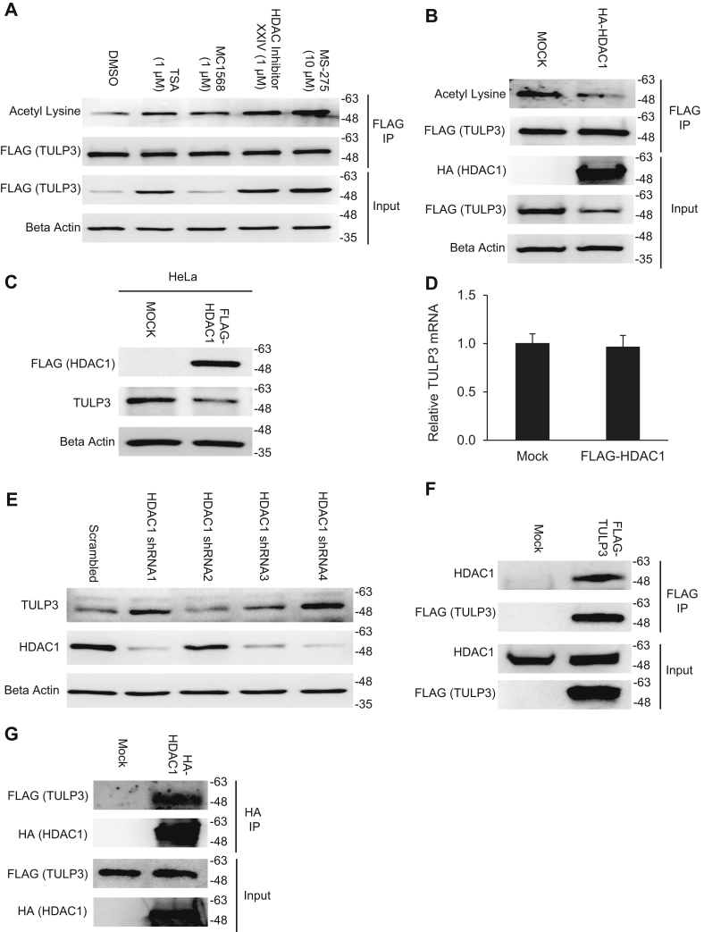 HDAC1 deacetylates TULP3 and reduces its protein levels.A, western blot showing acetylation and total protein levels of stably expressed FLAG-TULP3 in 293T cells treated with DMSO, 1 μM TSA, 1 μM MC1568, 1 μM HDAC Inhibitor XXIV, or 10 μM MS-275 for 16 h. B, acetylation and total protein levels of stably expressed FLAG-TULP3 in 293T cells transfected with empty pcDNA 3.1(+) or a plasmid encoding HA-HDAC1. Cells were harvested 48 h posttransfection. C, western blot showing endogenous levels of TULP3 in Hela cells transfected with either empty pcDNA 3.1(+) or a plasmid encoding FLAG-HDAC1. Cells were harvested 48 h posttransfection. D, mRNA levels of endogenous TULP3 corresponding to treatments in (C) analyzed by qRT-PCR; n = 4 technical replicates, Mean ± S.D. shown. E, western blot of HDAC1 and TULP3 protein levels following stable transduction of HDAC1 shRNAs into HeLa cells. Western blots showing coimmunoprecipitation of F FLAG-TULP3 with HDAC1 or G HA-HDAC1 with FLAG-TULP3 in 293T cells.
