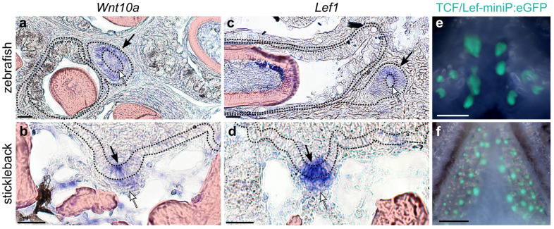 Wnt signaling in zebrafish and stickleback replacement tooth germs. Black arrows mark replacement tooth germ epithelium, white arrows mark replacement tooth germ mesenchyme.