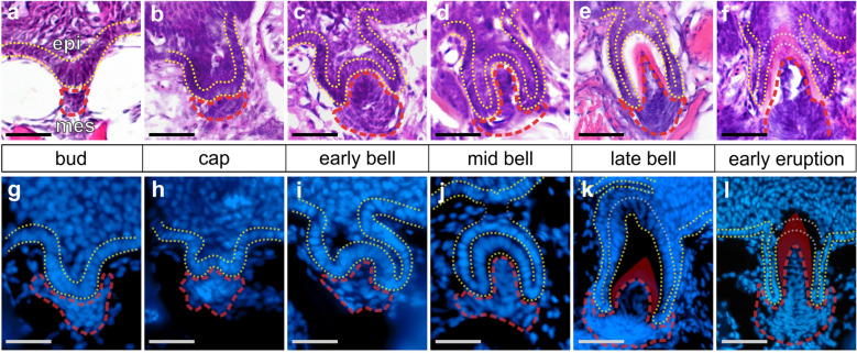 Stickleback pharyngeal tooth morphogenesis. All images show sagittal or transverse sections from sticklebacks (20–40 mm standard length). The basalmost layer of epithelium is outlined with yellow dashed lines in all panels, the mesenchyme is outlined in red. During late bell stages (