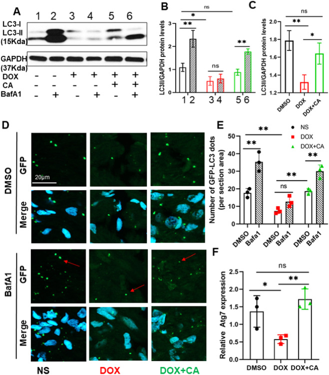 Fig. 3 Effect of CA on autophagy in adult zebrafish DIC model. (A) Representative western blot showing changes in LC3II protein levels in the heart after DOX and CA treatment. Baflomycin A1 (30 nM) was administered 4 h before sacrifice the fish to assess autophagic flux changes. (B, C) Quantification of relative amounts of LC3II. n = 3 hearts per group on each time point. Bars represent mean ± SD. (D, E) Representative images and quantification of sectioned ventricles of Tg(GFP-Lc3) fish at 56 dpi with or without BafA1 treatment. Arrows: Lc3 aggregating dots formed during autophagy. (F) Relative RNA expression degree of atg7 in indicated group. *P < 0.05, **P < 0.01.