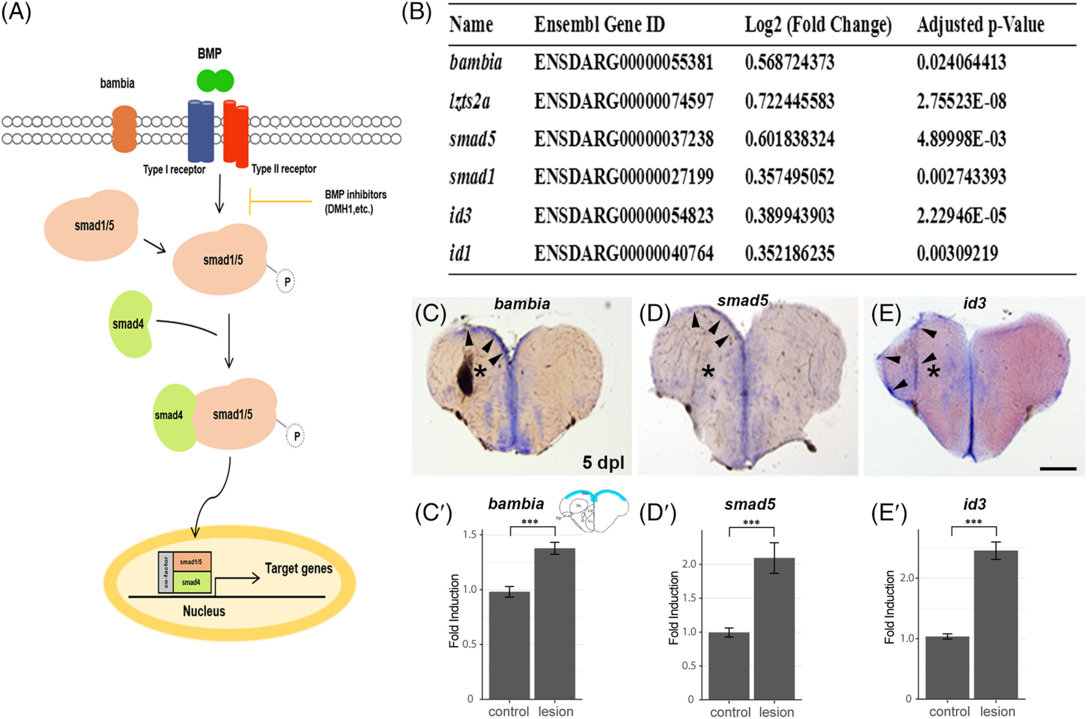 Fig. 6 Genes involved in canonical BMP signaling are induced in response to telencephalic injury. A, Scheme of the BMP signaling pathway. B, RNAseq analysis of injured telencephala hemispheres in comparison to uninjured hemispheres reveals an upregulation in mRNA expression of BMP signal transducers (smad5), regulators (bambia) or downstream target genes (id3, id1). C‐E, In situ hybridization on sections of the adult zebrafish telencephalon 5 days postlesion. C, bambia, D, smad5, E, id3. Arrowheads indicate upregulation of gene expression in the left telencephalic hemisphere upon stab injury. C′‐E′, Quantification of C´bambia, D′, smad5, and E′, id3 expression upregulation 5 days postlesion. Only upregulated areas were quantified along the control and injured ventricular zone from the dorsomedial to the dorsolateral region of the telencephalon (scheme in the upper right‐ hand corner of (C′) shows the quantified area in blue). Significance is indicated by asterisks: ***P < .001. P‐values: bambia: 0.00008917 (C′), smad5: 0.003684 (D′), id3: 7.455 x 10−7 (E′). Scale bar = 200 μm (C, D, E)