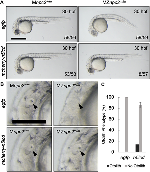 Fig. 11 (A) Live imaging of 30 hpf Mnpc2+/m and MZnpc2m/m embryos injected with either egfp or mcherry-n5icd (notch3 intracellular domain) plasmid DNA at the 1-cell stage. Some of the mcherry-n5icd-injected MZnpc2m/m embryos (13.92±4.43%) displayed a relatively normal phenotype in comparison with egfp-injected MZnpc2m/m embryos. Numbers of embryos examined showing representing staining over total numbers of embryos examined are indicated in each image (n=4 experiments). Scale bar: 500 μm. (B) Magnifications of the images shown in A in the area of the otic vesicle. Both otoliths and otic vesicle were restored in this mcherry-n5icd-injected MZnpc2m/m embryo (arrowheads). Scale bar: 250 μm. (C) Quantification of otolith phenotype recovery in egfp- (n=59) and mecherry-n5icd-injected MZnpc2m/m embryos (n=58). P=0.0028 for ‘no otolith' in n5icd-treated group versus ‘no otolith' in egfp-treated group (χ2, Fisher's exact text).