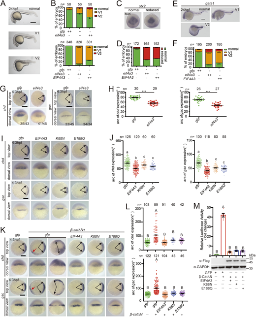 Fig. 4 (A) Representative views of siblings and eif4a3 mutants with a p53 mutant background at 24 hpf. (B,C) Expression of the indicated markers gata1 and rx1 in siblings and eif4a3 mutants with the p53−/− background at 24 hpf. (D) Expression of the indicated dorsoventral markers in siblings and eif4a3 mutants with the p53−/− background at 6 hpf. (E) Quantification of the arc of marker expression shown in D. (F) Expression of the indicated anteroposterior neural markers in siblings and eif4a3 mutants with the p53−/− background at 12.5 hpf. Lateral views with the dorsal side to the right and animal pole upwards. (G) Expression of cdx4 and sp5l in eif4a3 mutants and siblings with the p53−/− background at 80% epiboly stage. Arrowheads indicate the edges of the indicated mRNA expression domains. Lateral views with the dorsal side to the right and animal pole upwards. (H) Depletion of eif4a3 with the p53−/− background elevates the expression of the indicated Wnt direct target genes at 80% epiboly stage, as indicated by qRT-PCR analysis. Embryos are from three pairs of adult fish. Embryos were raised to each indicated stage, subjected to the whole-mount in situ hybridization analysis, photographed and then genotyped in A-G. Each embryo was genotyped and subjected to qRT-PCR in H. Data are mean±s.e.m. *P<0.05; **P<0.01; ***P<0.001. Unpaired t-test, two-tailed. Scale bars: 200 μm.
