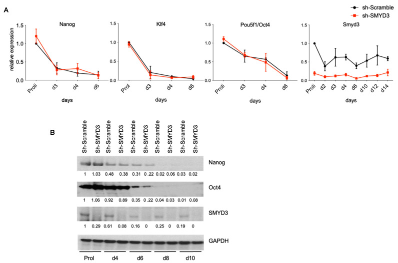 Figure 2 SMYD3 depletion does not interfere with stemness. (A) mRNA was extracted at different stages of ESC differentiation, and Smyd3 or pluripotency-related gene (Nanog, Klf4, Pou5f1/Oct4) transcript levels were evaluated throughout differentiation by qRT-PCR. Means and SEM from three independent experiments are shown. (B) Nanog, Oct4 and SMYD3 protein levels were analyzed by immunoblot. Data were normalized to GAPDH. Normalized band intensity in immunoblots is reported below signals. Representative image of three independent experiments.