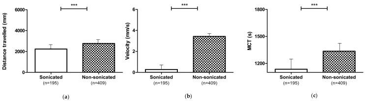 Figure 4 Locomotor performances of larvae (dystrophic and non-dystrophic) treated with non-sonicated or sonicated 1,3-1,6 β-glucans at 2, 4, and 8 mg L−1: (a) Distance travelled; (b) Velocity; (c) MCT. Data are given as mean and standard error. (*** p ≤ 0.001).