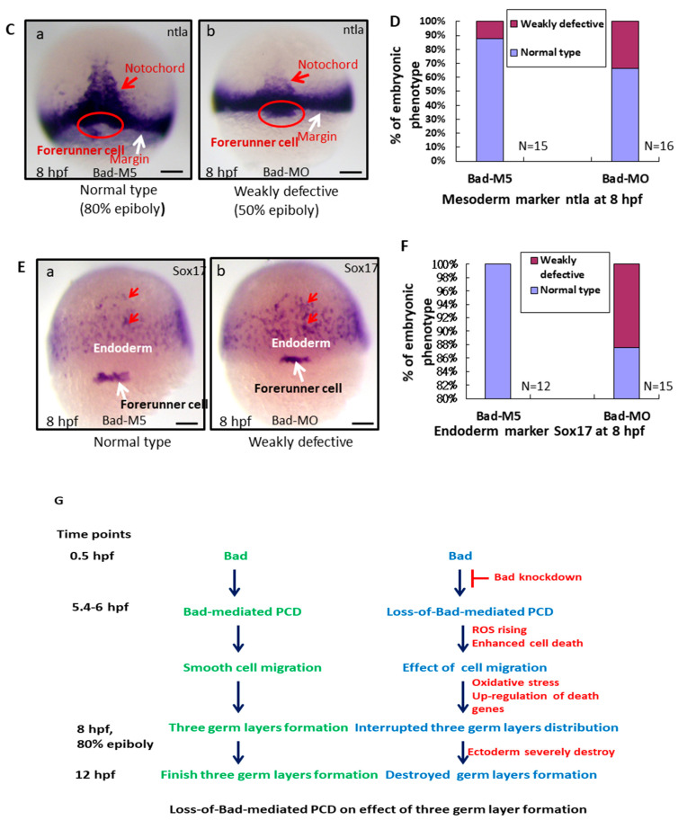 Figure 4 cont. Bad-mediated PCD can regulate cell movement and cells in three-germ-layer targeting to destination sites, as shown via in situ hybridization. Morphological analysis of embryos injected with either 25 ng of control-MO (Bad-M5) or Bad-MO and examined at 8 hpf after ectoderm, mesoderm, and endoderm tissues were stained with cyp26, ntla, and sox17, respectively, via in situ hybridization. (A) The embryos are stained with cyp26 (side view, panels a–c; top view, panels d–f), with the presumptive brain (PB) indicated by white arrows and the mesoderm by red arrows. (B) Quantification of loss-of-Bad-induced PCD effects on ectoderm migration in connection to abnormal brain development at 24 hpf. All data were analyzed using either paired or unpaired Student’s t-tests, as appropriate. p < 0.01. (C) Bad knockdown can induce mild mesoderm defects, as shown by probing with the mesoderm marker ntla gene. Panels a (Bad-M5 group) and b (Bad-MO group): notochord profile indicated by red arrows; margin pattern indicated by white arrow; and forerunner cell indicated by red circle. Bars indicate 100 μm. (D) Quantification of mild loss-of-Bad-induced PCD effects on mesoderm pattern. All data were analyzed using either paired or unpaired Student’s t-tests, as appropriate. p < 0.01. (E) Bad knockdown can induce very mild endoderm defects, as shown by probing with the endoderm marker sox17 gene. Panels a,b, endoderm signal indicated by red arrows and forerunner cell by white arrow. The defect ratio was counted and is shown in (F). All data were analyzed using either paired or unpaired Student’s t-tests as appropriate. p < 0.01. (G) Sketch illustrating how loss-of-Bad-mediated PCD affects smooth cell migration during the formation of the three germ layers at 8 hpf: environmental stress in the form of ROS production was increased, and enhanced cell death further interrupted brain development at a later developmental stage.