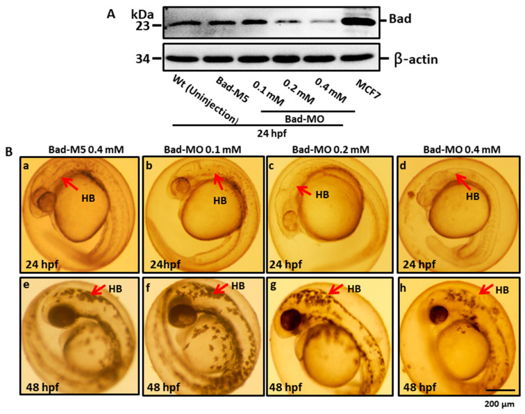 Figure 5 BH3-only proapoptotic gene Bad can regulate brain development between 24 and 48 hpf. (A) Dosage dependence of Bad knockdown (lanes 3–5 for 0.1, 0.2, and 0.4 mM, respectively) shown by Western blot analysis and compared with the uninjected group (lane 1) and the normal control Bad-M5 group (lane 2). The positive control MCF7 cell lysate is shown in lane 6. (B–D) Identification of morphological phenotype defects in the brain during Bad knockdown with dosage response. Each one-cell-stage embryo was injected with either 0.4 mM of control-MO or 0.1, 0.2, or 0.4 mM of Bad-MO. At 24 and 48 hpf, embryos were observed under a microscope. Phase-contrast images of the control-MO-injected (Ba,e) and Bad-MO [lower dose (0.1 mM)-injected; (Bb,f)] embryos show normal brain development. However, the embryos injected with higher doses of Bad-MO embryos show abnormal brain development ((Bc,g), 0.2 mM; (Bd,h) 0.4 mM at 24 and 48 hpf, respectively) in the hindbrain (HB), indicated by arrows. The defect rates (N, up to 120 embryos) were counted and are shown in Figure 3C,D for 24 and 48 hpf, respectively, revealing a statistically significant difference.
