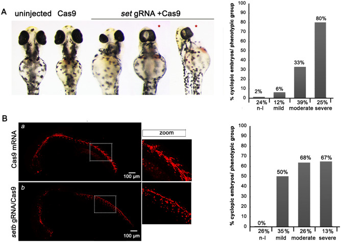 Impact of targeting the setb gene on Hedgehog signaling in zebrafish embryos. (A) Zebrafish setb crispants exhibit cyclopia. One- to two-cell stage zebrafish embryos were injected with 4.6 nl of 150 ng/μl of Cas9 mRNA or with 50 ng/μl of setb gRNA and 150 ng/μl of Cas9 mRNA and were examined morphologically at 48 hpf. (Right graph). Phenotypic scoring of the injected embryos (n = 262, n denotes the number of injected embryos). Numbers in X-axis refer to percentage of embryos in each phenotypic group and numbers on the bars refer to the percentage of cyclopic embryos in each phenotypic group. (B) Hh signaling is reduced in Tg12x_Gli transgenic zebrafish embryos injected with setb gRNA/Cas9. One- to two-cell stage Tg12x_Gli transgenic zebrafish embryos were injected with setb gRNA/Cas9 and examined under a confocal fluorescence microscope at 24 hpf. The phenotypic scoring of the injected embryos is shown in the graph (n = 96). The squares show enlargement of the trunk areas that display decreased mCherry fluorescence intensity. Note the disrupted morphology of the somites in the marked regions.
