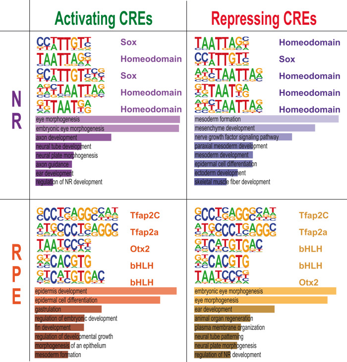 Representative TF motifs enriched in activating (left column) and repressing (right column) CREs in both the NR and RPE domains. Analysis of GO terms enrichment for genes associated with each set of elements is indicated.