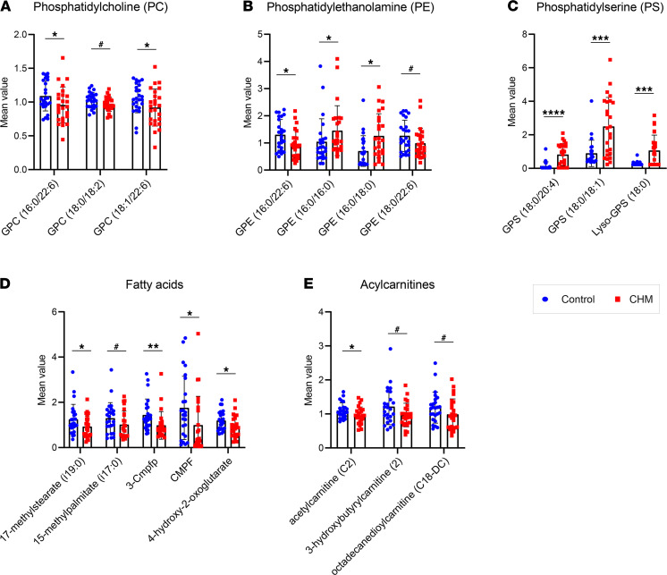 Figure 5 Metabolites involved in lipid metabolism subclasses differentially detected in CHM patients. (A–E) Bars represent mean ± SD of control (blue) and choroideremia (red) plasma samples (n = 25). P value was determined using matched pair t tests. *P ≤ 0.05, **P ≤ 0.01, ***P ≤ 0.001, ****P ≤ 0.0001. #0.05 < P ≤ 0.1. GPC, glycerophosphocholine; GPE, gylcerophosphoethanolamine; GPS, glycerophosphoserine; 3-Cmpfp, 3-carboxy-4-methyl-5-pentyl-2-furanpropionate; CMPF, 3-carboxy-4-methyl-5-propyl-2-furanpropanoate.