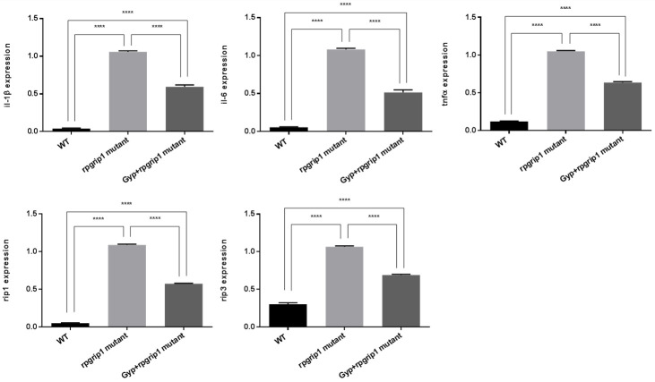 Figure 6 Gyp treatment reduced the expression of inflammation associated genes in rpgrip1 mutant zebrafish eye samples. Expression of il-1β, il-6, tnfα, rip1 and rip3 in eyes of wildtype (WT), untreated (UT) and Gyp-treated rpgrip1 mutant zebrafish at 6 mpf was determined by qRT-PCR. Statistical comparisons between individual groups were carried out using one-way ANOVA followed by Bonferroni’s test. Data are displayed as mean ± SEM (n = 6 animals of each group). **** p < 0.0001.