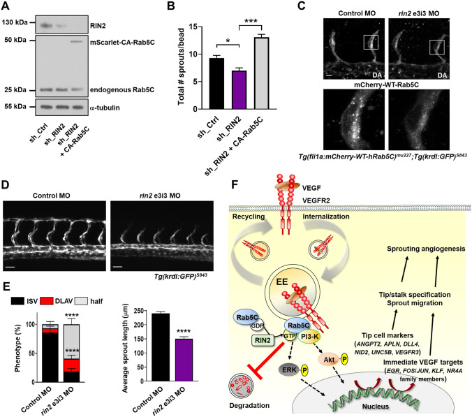 Fig. 7 RIN2 regulates Rab5C recruitment and is required for sprouting angiogenesis in vivo. a Representative Western blot showing the expression of RIN2, endogenous Rab5C, and mScarlet-CA-Rab5C in HUVECs. b Quantification of the total number of sprouts/bead was assessed from confocal microscopy z-stacks for the indicated conditions after 24 h of sprouting. Values represent the means + SEM of n = 33 beads (sh_Ctrl), n = 35 beads (sh_RIN2), n = 48 beads (sh_RIN2 + CA-Rab5C), pooled from 3 independent experiments. c Tg(fli1a:mCherry-WT-hRAB5C)mu227;Tg(kdrl:GFP)s843 zebrafish embryos were injected with control MO (left) or rin2 MO (right) and imaged by confocal microscopy to visualize Rab5C localization. Scale bars, 10 μm. DA, dorsal aorta. d Maximum projections of z-stacks obtained by confocal microscopy showing ISV formation at 32 hpf in Tg(kdrl:GFP)s843 zebrafish embryos injected with Control MO (left) or rin2 MO (right). Scale bars, 40 μm. e Quantification of ISV development (left) as well as average sprout length (right) in zebrafish embryos injected with Control MO or rin2 MO. Control MO: N = 12 embryos, n = 84 ISVs; rin2 MO: N = 10 embryos, n = 72 ISVs. Indicated are statistically significant differences in DLAV and ‘half’ phenotypes compared to Control MO. f Model summarizing the main results of this study. Rab5C and the Rab5 GEF RIN2 protect the EE pool of VEGFR2 from VEGF-induced degradation, which sustains VEGF signaling and is required for the expression of immediate VEGF targets and tip cell genes. Together, these events regulate tip cell specification, endothelial cell migration, and sprouting angiogenesis
