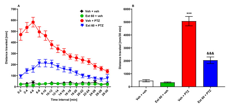 Figure 1 The influence of Zingiber officinale rhizoma methanolic extract on seizure-like behavior in the PTZ-induced hyperlocomotion assay in zebrafish. After 24 h incubation in Zingiber officinale rhizoma methanolic extract (60 µg/mL), 7-day-old zebrafish larvae were exposed to an acute dose of PTZ (20 mM). Larval behavior was assessed 5 min after PTZ application. Results of the experiment are depicted as: (A) distance covered by larvae in 2 min long time bins, and (B) total distance covered by larvae during 30 min of the assay. Data were analyzed using one-way or two-way ANOVA with repeated measures followed by Tukey’s or Bonferroni’s post hoc test, respectively. Data are depicted as a mean ± standard error of the mean (SEM). Veh + veh (n = 31), Ext 60 + veh (n = 24), Veh + PTZ (n = 48), Ext 60 + PTZ (n = 48). *** p < 0.001 vs. Veh + veh; &&& p < 0.001 vs. Veh + PTZ. Ext 60—Zingiber officinale methanolic extract (60 µg/mL), PTZ—pentylenetetrazole, Veh—vehicle. n—refers to the total number of larvae.