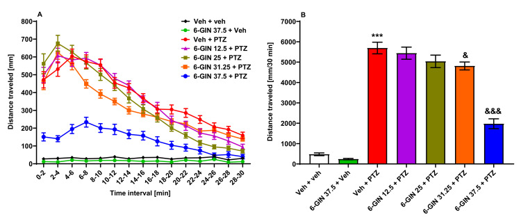 Figure 4 The influence of 6-GIN on the seizure-like behavior in the PTZ-induced zebrafish hyperlocomotion assay. After 24 h incubation in different doses of 6-GIN (12.5, 25, 31.25, or 37.5 µM), 7-day-old zebrafish larvae were exposed to PTZ (20 mM). Larval behavior was assessed 5 min after PTZ administration. Results of the assay are depicted as: (A) distance covered by larvae in 2 min long time bins, and (B) total distance covered by larvae during 30 min of the assay. Data were analyzed using one-way or two-way ANOVA with repeated measures followed by Tukey’s or Bonferroni’s post hoc test, respectively. Data are depicted as a mean ± SEM. Veh + veh (n = 48), 6-GIN 37.5 + Veh (n = 48), Veh + PTZ (n = 64), 6-GIN 12.5 + PTZ (n = 47), 6-GIN 25 + PTZ (n = 56), 6-GIN 31.25 + PTZ (n = 48), 6-GIN 37.5 + PTZ (n = 37). *** p < 0.001 vs. Veh + veh; &&& p < 0.001, & p < 0.05 vs. Veh + PTZ. 6-GIN—6-gingerol, PTZ—pentylenetetrazole, Veh—vehicle. n—refers to the total number of larvae.