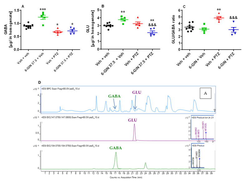 Figure 6 Determination of (A) GABA, (B) GLU, (C) GLU/GABA ratio, and (D) the total ion chromatogram (A) of the water: acetonitrile extract from zebrafish larvae with extracted ion chromatograms and MS/MS spectra of GLU and GABA in 7-day-old zebrafish larvae by HPLC-MS. After a 24 h incubation in 6-GIN (37.5 µM), zebrafish larvae were exposed to an acute dose of PTZ (20 mM) for 90 min. Next, whole zebrafish larvae were collected in a pool of n = 100/sample. Data were analyzed using one-way ANOVA followed by Tukey’s post hoc test. Data are depicted as mean ± SEM. Veh + veh (n = 9), 6-GIN 37.5 + Veh (n = 5), Veh + PTZ (n = 5), 6-GIN 37.5 + PTZ (n = 5). *** p < 0.001, ** p < 0.01, * p < 0.05 vs. Veh + veh; &&& p < 0.001 vs. Veh + PTZ. 6-GIN—6-gingerol, PTZ—pentylenetetrazole, Veh—vehicle. n—refers to the total number of samples.