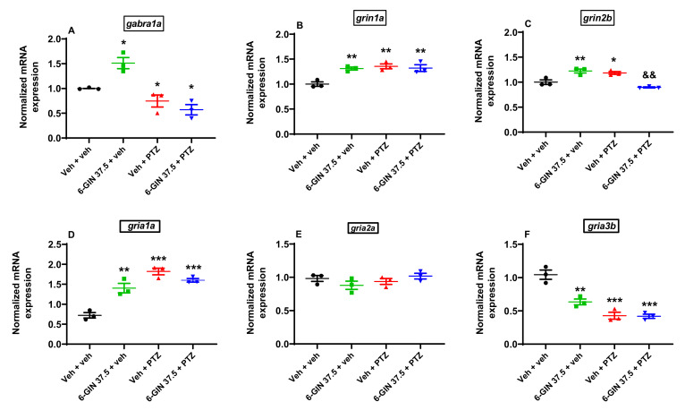 Figure 7 The effect of 6-GIN on (A) gabra1a, (B) grin1a, (C) grin2b, (D) gria1a, (E) gria2a, and (F) gria3b mRNA expression in PTZ-treated zebrafish larvae. After a 24 h incubation in 6-GIN (37.5 µM), zebrafish larvae were exposed to PTZ (20 mM) for 90 min. Next, zebrafish larvae were collected in a pool of n = 10/sample. mRNA levels were normalized against gapdh. Data were analyzed using one-way ANOVA with Tukey’s post hoc test. Data are depicted as a mean ± SEM (n = 3/group). *** p < 0.01, ** p < 0.01, * p < 0.05 vs. Veh + veh; && p < 0.01 vs. Veh + PTZ. 6-GIN—6-gingerol, PTZ—pentylenetetrazole, Veh—vehicle. n—refers to the total number of samples.