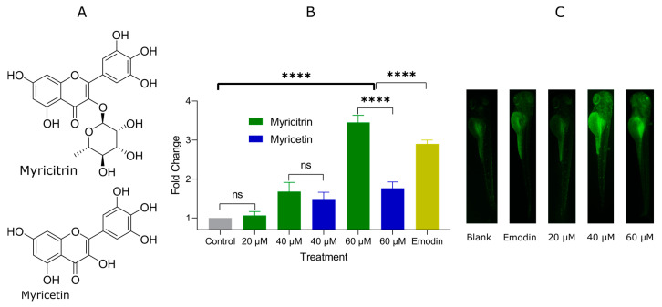 Figure 2 Myricitrin and myricetin-induced 2-NBDG uptake. (A) Chemical structures of myricitrin and myricetin. The structures were identified on the basis of HR MS/MS (Figure S2) and NMR spectra (Figure S3). (B) Fold change of 2-NBDG fluorescence measured by ImageJ (**** p < 0.001, ns, no statistical difference). The higher fold change indicates the better promotion of glucose uptake. (C) Fluorescent microscopy images after treatment of myricitrin and emodin.