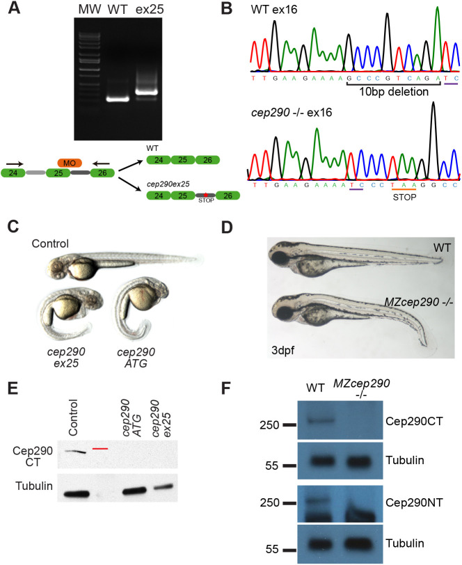 Fig. 1. Cep290 disruption causes ciliopathy in zebrafish. (A) RT-PCR from representative single wild-type (WT) and cep290ex25 morphant embryos. Cep290 morpholino oligonucleotide targeted to the exon 25 splice donor caused mispliced RNAs and intron retention. (B) Chromatogram of a CRISPR/Cas9-generated single representative genetic cep290 mutant showing the 10-bp deletion in exon 16 that results in a premature stop codon. (C) Morphology of an uninjected embryo compared to cep290ex25 and cep290ATG morphants at 2 dpf. (D) Morphology of wild-type and MZcep290fb208/fb208 mutants (hereafter called MZcep290−/− mutants) at 3 dpf. (E) Western blot showing loss of Cep290CT immunoreactivity in cep290ATG and cep290ex25 morphants (pool of 40 48-hpf embryos). The position of the 250-kDa molecular weight marker is indicated in red. A tubulin antibody was used as a loading control (bottom). (F) Western blot showing loss of Cep290CT and Cep290NT immunoreactivity in MZcep290−/− mutants. A tubulin antibody was used as a loading control. Experiments were replicated a minimum of three times.