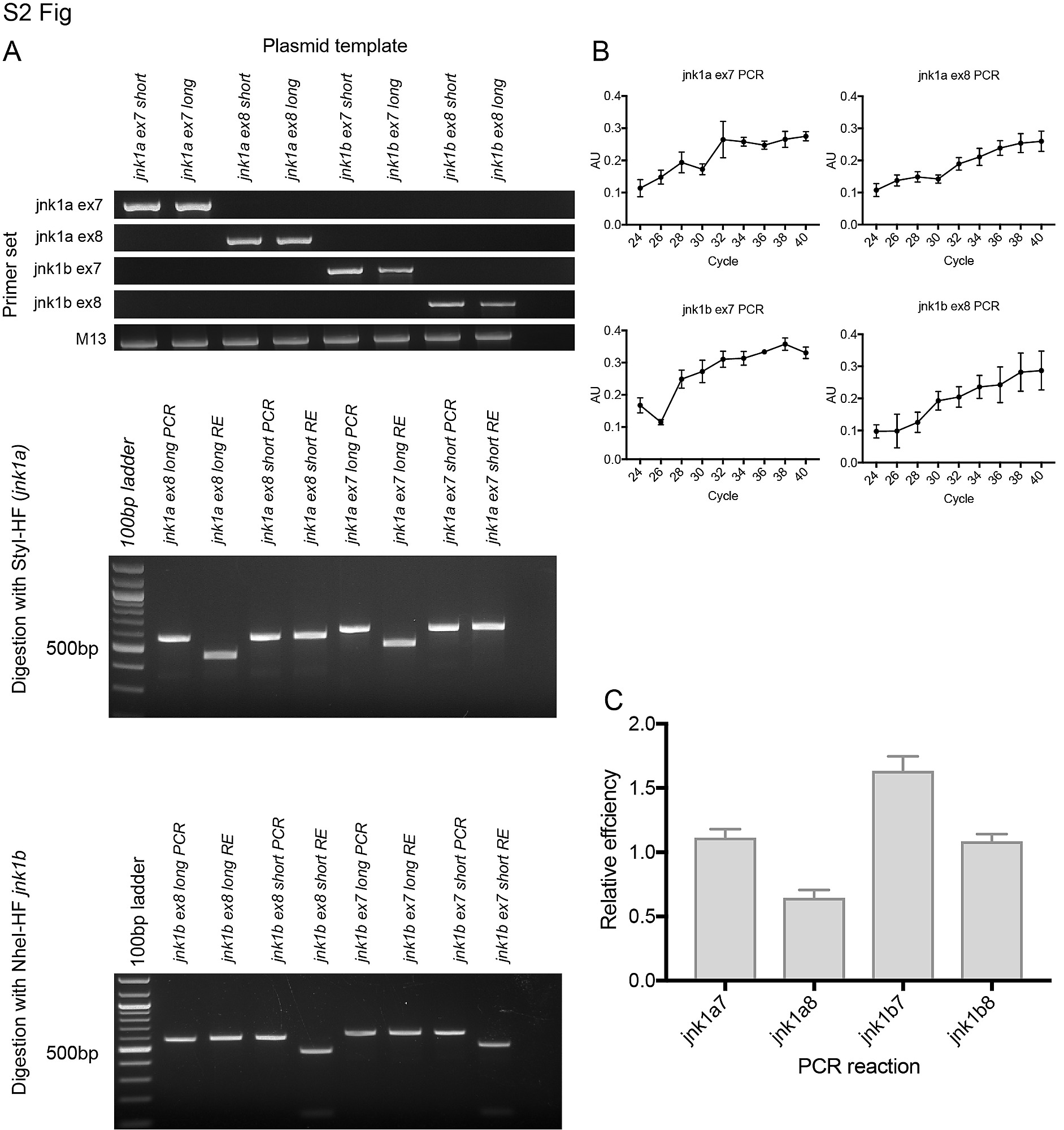 Fig. s2 Validation of splicing assay. (A) specificity of primers used in RT-PCR splicing assay. Primers sets to identify Ex7 and Ex8 containing variants of both jnk1a and jnk1b transcripts were assessed against all 8 transcripts contained within plasmids, using primers for the plasmid backbone (M13) as loading control. Restriction enzyme digests showing original PCR product and complete digestion by enzyme to identify C-terminal extension in jnk1a and jnk1b transcripts. (B) Graphical representation of gel densitometry indicating the splicing assay was carried out during the linear phase of amplification for jnk1a and jnk1b Ex7 and Ex8 PCR (Arbitrary logarithmic Units). (C) PCR with plasmid containing transcripts were used as positive controls for PCR reactions and indicated efficiency of each reaction.