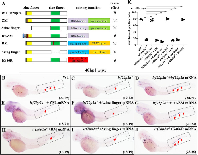 (A) Structure, missing function and rescue effect of wild type and variant forms of Irf2bp2a. (B-J) Irf2bp2a mRNA rescue assays in irf2bp2a-/- embryos. Mpx probe was used in WISH to examine rescue effect with wild irf2bp2a (D), ZM (E), Δzinc finger (F), tet-ZM (G), RM (H), Δring finger (I) and K486R mutant (J) mRNA injections. (K) The statistical significance was calculated by using one-way ANOVA. The statistical significance was calculated using 1-way ANOVA followed by Dunnett T3 correction. The asterisk indicates a statistical difference (N = 5, 15–25 embryos were used for each experiment. Each dot represents the mean value of one experiment. Error bars represent mean ± SEM. ns: no statistical significance; ***P < 0.001).