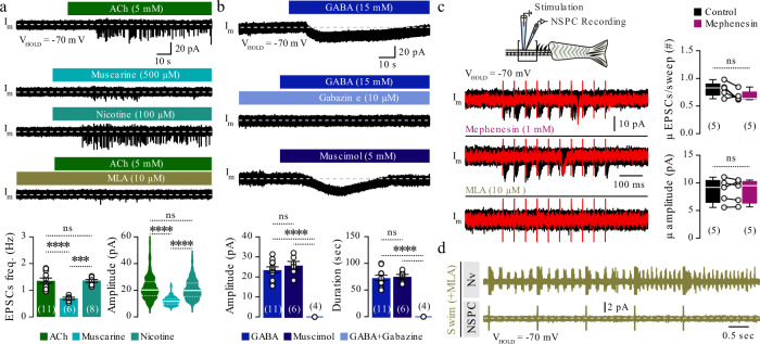 a Bath application of ACh induced inward currents in all recorded NSPCs (20 out of 20). Sample traces of the muscarine- and nicotine-induced inward currents in recorded NSPCs. Significant reduction of the induced ACh currents in the presence of the α7 nicotinic receptor antagonist MLA (10 μM). Quantification of the frequency (Hz; P = 3.237E-5) and amplitude (pA; P < 0.0001) of the recorded cholinergic currents. b Exogenous application of GABA induced tonic activation of NSPCs (22 out of 22). GABAergic tonic responses were completely abolished in the presence of the GABAA receptor antagonist, gabazine (10 μΜ). Exogenous application of muscimol (GABAA receptor agonist) induced tonic activation of NSPCs. Quantification of the amplitude (pA; P = 7.904E-8) and duration (s; P = 1.141E-7) of the GABA-related responses. c Schematic protocol for NSPC recordings during local electrical stimulation. Ten pulses (20 Hz) were applied to increase the probability of presynaptic release. Superimposed representative sample trace (in red) out of >40 sweeps (in black) from NSPC responses under control conditions, following application of the polysynaptic blocker mephenesin, and application of the selective nicotinic receptor antagonist MLA suggesting synaptic cholinergic, but not GABAergic activation of the NSPCs. Quantification of the average number of detected EPSCs per sweep and the average amplitude of the responses in control and after the application of polysynaptic blocker (mephenesin). d Application of MLA during locomotion abolishes the regular and strong input to NSPCs, implying a predominant role of nicotinic receptors. ACh, acetylcholine; GABA, γ-aminobutyric acid; MLA, methyllycaconitine; NSPC, neural stem/progenitor cell; Nv, motor nerve recording. The dashed gray line represents the baseline. Data are presented as mean ± s.e.m. and as violin plots. ***P < 0.001; ****P < 0.0001; ns, not significant. For detailed statistics, see Supplementary Table 1.
