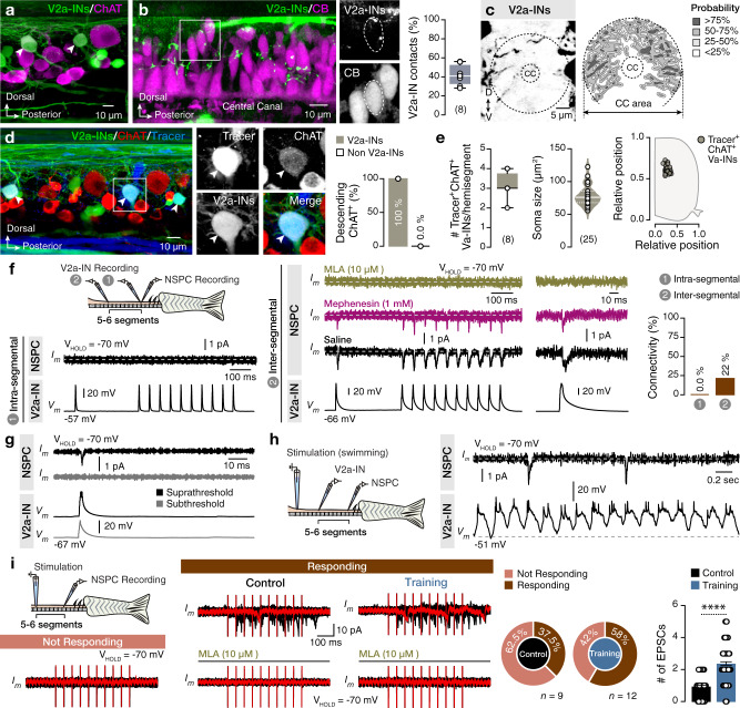 a Large and dorsally located spinal cord V2a-INs (Chx10:GFP+, green) are cholinergic (ChAT+, magenta). Arrowheads indicate double-labeled neurons (Chx10:GFP+ChAT+). b A sample stack from the central canal area showing the presence of V2a-IN (Chx10:GFP+) axonal collaterals (green) close to CB+ NSPCs (magenta) with analysis of the proportion of the CB+ NSPCs that are in close proximity with the V2a-IN (GFP+) processes. c Quantification of the probability of the V2a-IN axonal collaterals in the central canal region (n = 15 zebrafish). d Representative whole-mount confocal image showing that all (25 out of 25; 100% from 8 zebrafish) long descending (dextran tracer, blue; >10 segments) cholinergic (ChAT+, red) neurons are V2a-INs (GFP+, green). Arrowheads indicate triple-labeled neurons. e Quantification and analysis of the number, size and location of long descending cholinergic V2a-INs in the adult zebrafish spinal hemisegments. f Sample average (~25 sweeps) traces from dual electrophysiological recordings between a premotor V2a-IN and NSPCs, located in the same segment (intra-segmental, 1) or 5–6 segments rostrally (inter-segmental, 2). Cholinergic connections were observed in the inter-segmental pairs (22%, 11 out of 50 pairs) but not in the intra-segmental pairs (0%, 0 out of 15). g Postsynaptic responses in the recorder NSPCs generated from suprathreshold (black, with action potential) and not from subthreshold (gray, without an action potential) short pulse depolarization of the V2a-IN. h Ex vivo setup of the brain-spinal cord preparation allows simultaneous recordings of a NSPC and ipsilateral descending V2a-INs during fictive locomotion. Sample trace of a connected pair that, while the V2a-IN discharges during fictive swimming, the NSPC receives occasional input. i Illustration of recordings acquired during electrical stimulations. Ten pulses (20 Hz) of a rostral spinal cord segment were applied to depolarize V2a-INs connected to NSCs. Representative sample trace (in red) of superimposed sweeps (~20, in black) from not responding and responding NSPCs. Bath application of the selective nicotinic antagonist MLA (10 μM) abolished the recorded currents suggesting that they are cholinergic. Changes in the proportion of the recorded NSPCs that respond to electrical stimulation observed after training (n: number of recorded NSPCs). The average number of detected events per stimulation sweep from both sites was significantly higher in trained animals, suggesting adaptive changes in the innervation and the cholinergic release to the NSCs (P < 0.0001). The dashed gray line represents the baseline. CB, calbindin D-28K; CC, central canal; ChAT, choline acetyltransferase; EPSC, excitatory postsynaptic current; INs, interneurons; MLA, methyllycaconitine; NSPC, neural stem/progenitor cell. Data are presented as mean ± s.e.m., as violin plots and as box plots showing the median with 25/75 percentile (box and line) and minimum–maximum (whiskers). ****P < 0.0001. For detailed statistics, see Supplementary Table 1.
