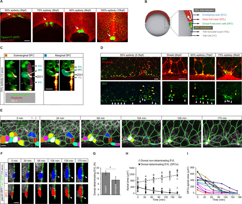(A) Dorsal views of confocal z-stack maximum projections showing the collective vegetal movement of DFCs between shield stage and 100% epiboly in a representative Tg(sox17::GFP) embryo injected with gap43-RFP mRNA. DFCs are in green (arrows) while the plasma membrane of all cells is in red. Note that the sox17::GFP transgene also labels the scattered population of endodermal cells at advanced stages of epiboly (see criteria to discriminate DFCs from endodermal cells in Material and methods) (extracted from Figure 1—video 1). Scale bar, 100 µm. (B) Schematic diagram of a cross section along the sagittal plane of the zebrafish embryo at 60% of epiboly. DFCs move to the vegetal pole ahead of the deep cell layer (DCL) margin, where mesendodermal progenitors internalise. (C) Confocal microscopy zy-plane of a 75% epiboly Tg(sox17::GFP) embryo (green) stained with phalloidin (red) and zonula occludens one protein (ZO-1) (white), showing submarginal (left) and marginal (right) DFCs connected with the EVL and YSL by focal apical attachments enriched in ZO-1 and F-actin (extracted from Figure 1—figure supplement 1). Scale bar, 20 µm. (D) Phalloidin and ZO-1 immunostaining (merge on top and ZO-1 on bottom) of the dorsal margin of wild-type embryos between 50% and 75% epiboly. Images correspond to surface confocal sections showing the apical domains of marginal (white arrowheads) and submarginal (yellow arrowheads) delaminating DFCs in contact with the YSL and EVL. Scale bar, 20 µm. (E) Time series of dorsal views of confocal z-stack maximum projections of a representative embryo injected with zo1-GFP and gap43-RFP between 50% and 80% epiboly, showing EVL cell junctions (green outlines) and the apical domains of EVL cells as they delaminate to become DFCs (coloured areas) (extracted from Figure 1—video 2). Scale bar, 20 µm. (F) Time series of confocal z-sections showing two delaminating EVL cells (DFCs) taken from panel E in lateral views (blue and red cells) as they move below the plane of the EVL epithelium during the process of delamination. Note that delaminating cells retain a focal apical attachment with the EVL (arrowhead, top) and YSL (arrowhead, bottom). Scale bar, 20 µm. (G) Quantification of the number of dorsal EVL cells undergoing delamination to become DFCs at both marginal and submarginal positions, expressed as means ± s.d. *p ≤ 0.05 (n = 49 marginal DFCs and 33 submarginal DFCs from three embryos). (H) Temporal changes in apical area of delaminating dorsal EVL cells (DFCs) (black triangles) and neighbouring non-delaminating dorsal EVL cells (white triangles) in a representative embryo during the process of delamination (n = 12 DFCs and 11 dorsal EVL cells from the representative embryo shown in E). Continuous and dashed lines indicate the mean values of apical area of delaminating and non-delaminating dorsal EVL cells, respectively. (I) Temporal changes in apical area of individual delaminating DFCs in a representative embryo during the process of delamination (n = 12 delaminating DFCs from the representative embryo shown in E). Each curve corresponds to a single cell. Animal is to the top in all image panels. Source data for all plots are provided in Figure 1—source data 1.