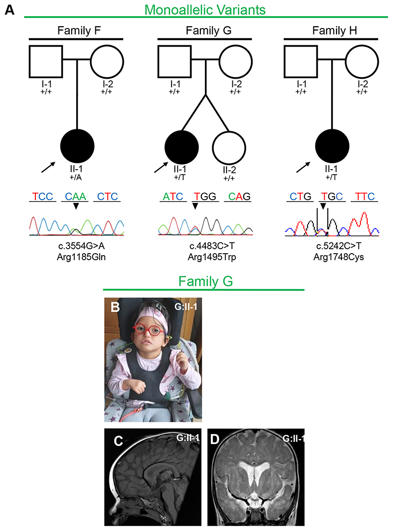 Fig. 2. Families with monoallelic PLXNA1 variants. a Pedigrees and Sanger sequencing results of three families with monoallelic de novo variants in PLXNA1. b–d Photographs and brain magnetic resonance image (MRI) of affected patient of family G. b G:II-1 showing unilateral facial palsy, dysmorphic right auricle and bilateral sensorineural hearing loss due to agenesis of vestibulocochlear nerves requiring cochlear implants. c Midsagittal T1 MRI of G:II-1 showing absent posterior pituitary and mild hypoplasia of brainstem. d Coronal T2 MRI of G:II-1 showing mild dilatation of the ventricular system, delayed myelination including the periventricular region.