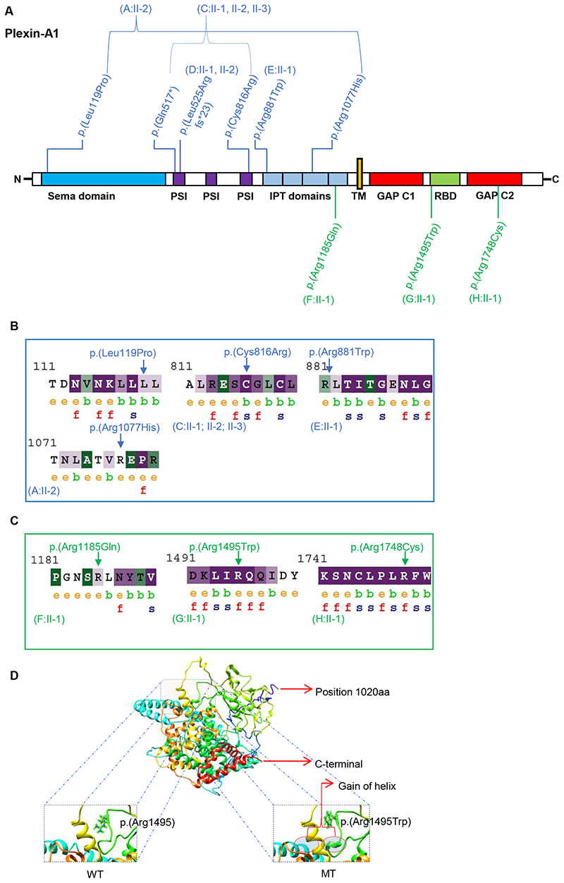 Figure 3 Fig. 3. Plexin-A1 variant distribution, conservation, and modeling. a Schematic protein domain structure adapted from St. Clair et al.5 and localization of Plexin-A1 variants. Note the nonrandom concentration of the biallelic variants (blue) in the extracellular domains and the monoallelic variants (green) toward the intracellular domains. GAP GTPase-activating protein, IPT Ig domain shared by plexins and transcription factors, PSI plexin-semaphorin-integrin domain, RBD Rho GTPase-binding domain, TM transmembrane region. b, c ConSurf analysis of the biallelic (b) and monoallelic (c) missense variants. The monoallelic variants (p.[Arg1185], p.[Arg1495], and p.[Arg1748]) are exposed suggesting functional residues in the protein. The intracellular residues p.(Arg1495) and p.(Arg1748) are evolutionarily conserved based on their ConSurf analysis suggesting that these residues react highly sensitively if altered. The biallelic missense variants (p.[Leu119Pro], p.[Cys816Arg], p.[Arg881Trp], p.[Arg1077His]) are noticed to be less conserved compared to the monoallelic variants with the p.(Cys816Arg) variant representing an exemption of this observation. e exposed, b buried, f functional, s structural. d 3D protein structure prediction shows replacement of the arginine long side chain by a flat aromatic ring of tryptophan (p.[Arg1495Trp]). Superimposition of the p.(Arg1495Trp) variant onto the wild-type structure showed that there is a gain of helix in the altered protein in close proximity to the site of variant. MT mutated, WT wild type.
