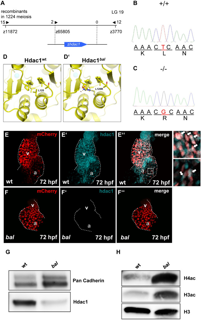 (A) Genetic map of the baldrian/Hdac1 gene locus. The bal mutation interval is flanked by the microsatellite markers z11872, z65805 and z3770. (B, C) Sequencing revealed the bal mutation to be a thymidine-to-guanine nucleotide transition in codon 125 within the zebrafish hdac1 gene. (D, D’) Homology model for Danio rerio Hdac1 (drHdac1), "type":"entrez-protein","attrs":{"text":"AAH85375","term_id":"55716026","term_text":"AAH85375"}}AAH85375, built from human HDAC1 structure 4BKX. wt and bal mutant structure of drHdac1, highlighting the active site zinc ion (cyan sphere) and L125. (D) Zoomed view of L125, showing the nonpolar interactions it makes with neighboring side chains within the hydrophobic core of drHDAC1. (D’) Modelled L125R mutant Hdac1. Steric clashes are represented as red disks. Modeled Arg rotamer was chosen based on the least number of steric clashes. (E-F”) IF staining on dissected hearts at 72 hpf, Hdac1 (turquoise) of Tg(myl7:mCherry) hearts (E-E”) or bal;Tg(myl7:mCherry) mutant hearts (F-F”) white arrows show Hdac1 costained cardiomyocytes of wt ventricle or atrium. (G) Western blot analysis of Hdac1 levels on protein lysates from bal and wt, demonstrating a drastic reduction in Hdac1 protein level in the bal mutants. (H) Western blot analysis of acetylation levels of Histone 3 (H3ac) and 4 (H4ac) of bal and wt protein lysates show a pronounced hyperacetylation of H3 and H4 in bal mutant embryos. pan Histone 3 served as loading control.