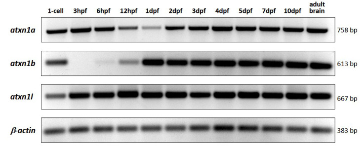 Figure 10. RT-PCR analysis of atxn1 gene expression level in whole-body zebrafish. Total RNA was isolated from embryos and larvae at different developmental stages (single-cell, 3 hpf, 6 hpf, 12 hpf, 1 dpf, 2 dpf, 3 dpf, 4 dpf, 5 dpf, 7 dpf, and 10 dpf) and from adult zebrafish brains. Gene-specific primer pairs for atxn1a, atxn1b, and atxn1l were used to amplify the reverse transcribed cDNAs. The primer pair for β-actin was used as a control. The sizes of the amplicons are given.