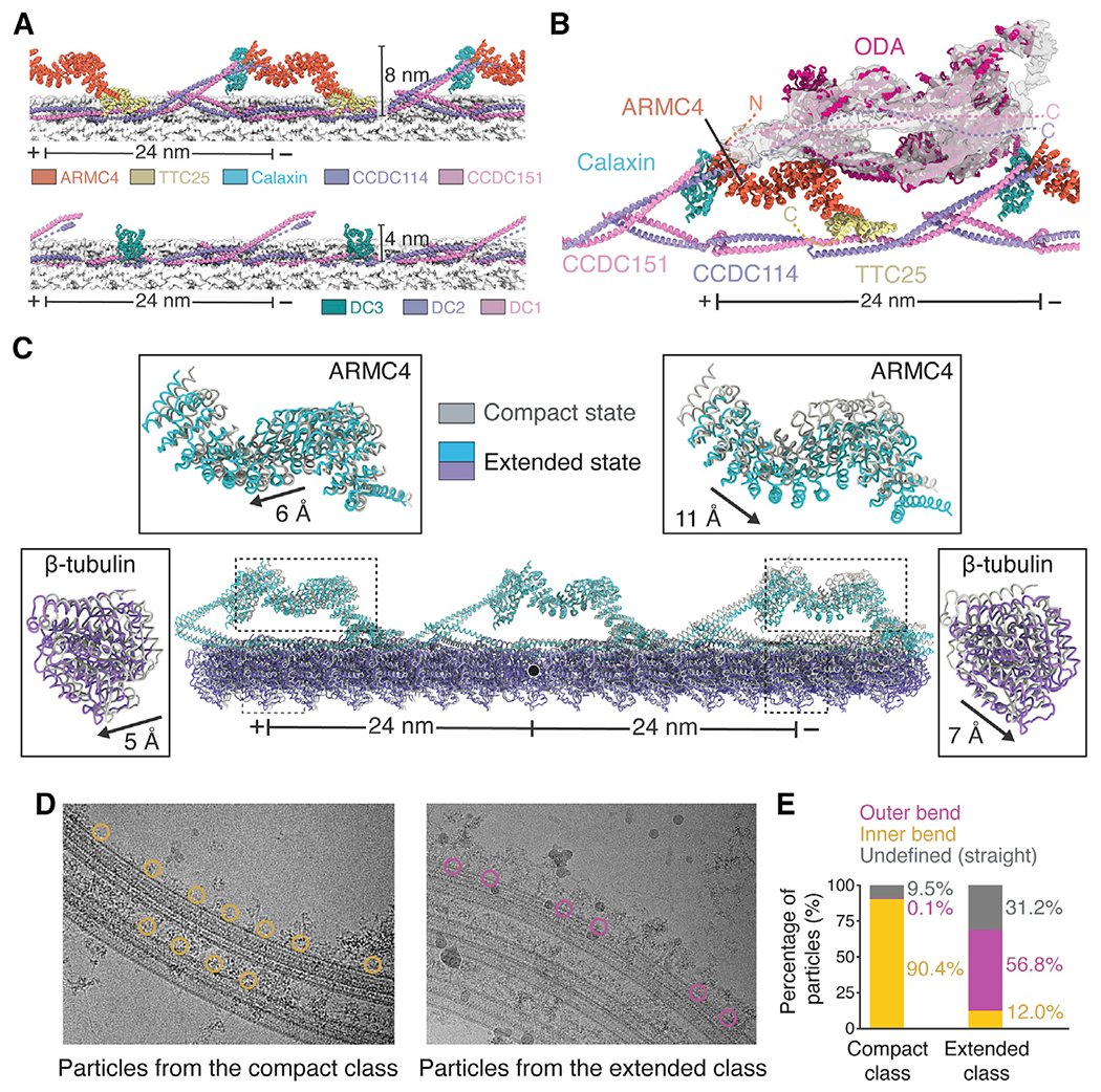 (C) Analysis of tubulin lattice spacing reveals an extended and compact conformation with different ODA-DC conformations. The two models are superposed on the central tubulin (marked with a black circle). The displacement of ARMC4 and β-tubulin between classes was calculated using the mass center of the molecules.