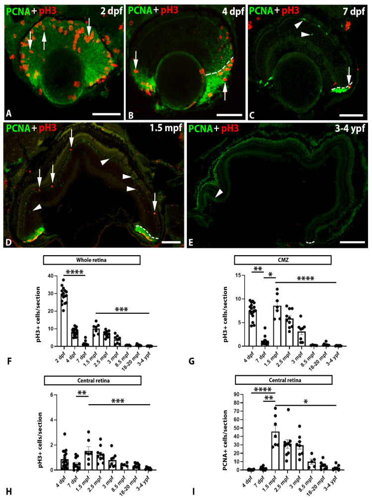 (A–E). Transverse sections of the retina of 2 dpf (A), 4 dpf (B), 7 dpf (C), 1.5 mpf (D), and 3–4 ypf (E) zebrafish specimens showing the presence of PCNA (arrowheads) or pH3 (arrows) positive cells. In 2 dpf to 1.5 mpf zebrafish (A–D), PCNA or pH3 expressing cells were mainly located in the CMZ but also in the central retina, while, in 3–4 ypf, specimens (E) pH3+ and PCNA+ cells almost disappeared. Dashed lines in (B–E) indicate the limit between the CMZ and the central retina. Scale bars: (A–C): 50 µm; (D): 100 µm; (E): 200 µm. (F). Graph showing significant changes in the number of pH3+ cells/section in the whole retina at different ages (Kruskal-Wallis test, p < 0.0001). (G). Graph showing significant changes in the number of pH3+ cells/section in the CMZ at different ages (Kruskal-Wallis test, p < 0.0001). (H). Graph showing significant changes in the number of pH3+ cells/section in the central retina at different ages (one-way ANOVA, p < 0.0001). (I). Graph showing significant changes in the number of PCNA+ cells/section in the central retina at different ages (Kruskal-Wallis test, p < 0.0001). Mean ± S.E.M. data and data on statistical multiple comparisons related to these graphs can be found on File S1. Asterisks indicate different levels of statistical significance: *, p < 0.05; **, p < 0.01; ***, p < 0.001; ****, p < 0.0001.