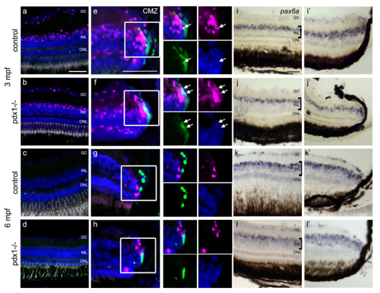pax6-expressing progenitors are not increased in chronic hyperglycemia. Tg(pax6b:dsRed) labeled cells (magenta) in the INL (a,b) and the CMZ (e,f) in 3 mpf control and pdx1−/− mutant retinas. Proliferating cells are labeled through EdU incorporation (green). In 6 mpf controls (c,g) and pdx1−/− mutants (d,h), pax6b:dsRed expression was not observed in the central area of the retina and was limited to few cells in the CMZ. In situ hybridization for pax6a stained cells in the basal portion of INL in the central area of the retina (i–l) and in the CMZ (i′–l′) in controls (i,i′,k,k′) and pdx1−/− mutants (j,j′,l,l′) at 3 mpf and 6 mpf. Scale bar: 50 µm. (GC, ganglion cell layer; INL, inner nuclear layer; ONL, outer nuclear layer).