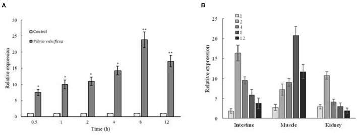 Expression analysis of Zetnf-b in ZF4 cells and zebrafish both infected by Vibrio vulnificus. (A) Expression profile of Zetnf-b using qRT-PCR in ZF4 cells infected with 0.1 MOI V. vulnificus. (B) Tissue expression of Zetnf-b using qRT-PCR in zebrafish infected with V. vulnificus. Total RNA was extracted from the cells, and qRT-PCR was conducted to analyze Zetnf-b and β-actin gene expression at 1 h post-stimulation (1 hpi), 2, 4, 8 and 12 hpi. Data are presented as mean ± standard error (SE) from three independent experiments. * indicates significant difference at P < 0.05. ** indicates significant difference at P < 0.01.