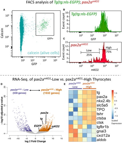 Fig. 9 A–C. Cells from the thyroid gland of 5 mpf Tg(tg:nls-GFP); pax2amKO2 animals were labeled with calcein (live cell marker) and analyzed using FACS. (A) A FACS plot showing calcein on y-axis and GFP on x-axis. The box encompassing the GFP+ cells represents the thyrocyte population, which was gated for further analysis. (B) Histogram showing the distribution of GFP intensity in thyrocytes. (C) Histogram showing the distribution of mKO2 intensity in thyrocytes. Thyrocytes were selected by gating for GFP+ population. Horizontal lines indicate the mKO2-Low and mKO2-High expression level, with percentage values representing proportion of thyrocytes with mKO2-Low and mKO2-High expression. D, E. RNA-Seq analysis of transcriptome isolated from pax2amKO2-High and pax2amKO2-Low subpopulations. (D) Volcano plot representing the differential expression of genes between the two thyrocyte subpopulations. Dots for pax2a, tg, mKO2, and EGFP are marked. Dots for genes that display significant differential expression (DESeq2, adjusted P-value < 0.05) are colored. (E) Heatmap displaying the expression of selected genes in the two subpopulations. Biological replicates are represented by individual columns.