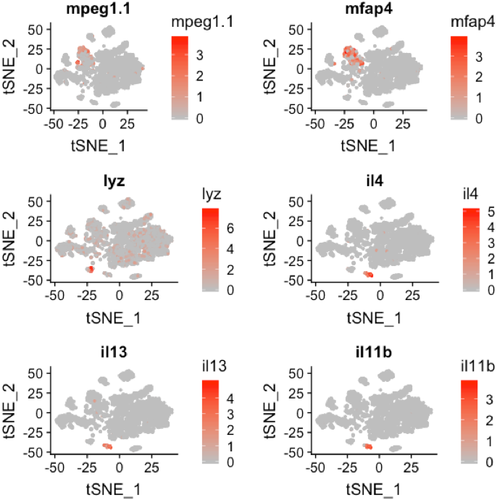 Fig. 3.4 t-SNE plot overlaid with gene expression for genes specific to macrophages (mpeg1.1 and mfap4), neutrophils (lyz), and lymphocytes (il4, il13, and il11b). The color scale represents the normalized expression counts for each gene ranging from lowest (gray) to highest (red).