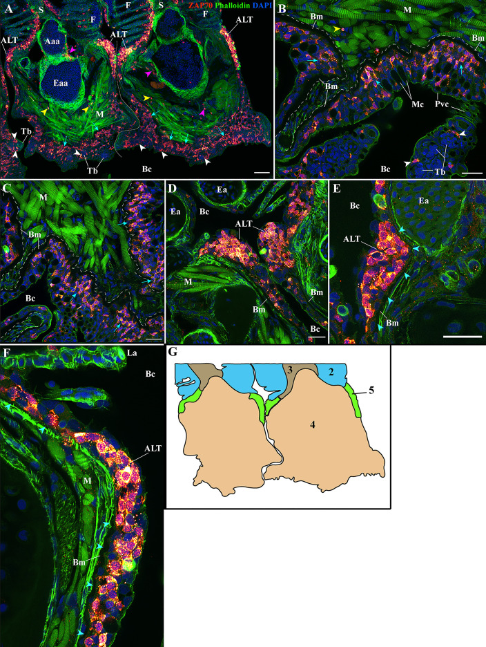 Organization of the zf-GIALT at the gill arch. (Sub-regions 4-5). Representative deconvolved confocal high-resolution images of adult zebrafish gills acquired with a transversal orientation. Images were acquired from 30 μm whole-body cryosections stained with phalloidin (green) and DAPI (blue) and where T/NK cells were labeled with anti-ZAP70 antibody (red hot). The localization of the GIALT sub-regions is illustrated in
