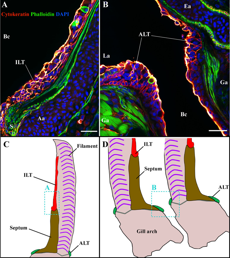 The ILT and ALT are structured by a complex network of reticulated epithelial cells. Representative deconvolved confocal images of adult zebrafish gills displaying the ILT