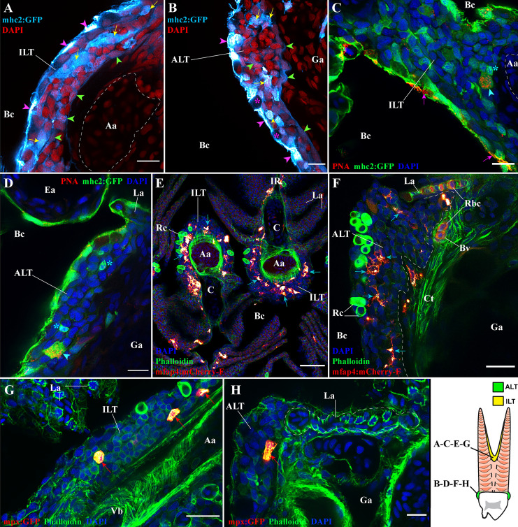 Antigen-presenting cells and granulocytes are also present within the ILT and ALT. Representative deconvolved confocal images of adult zebrafish gills displaying the ILT